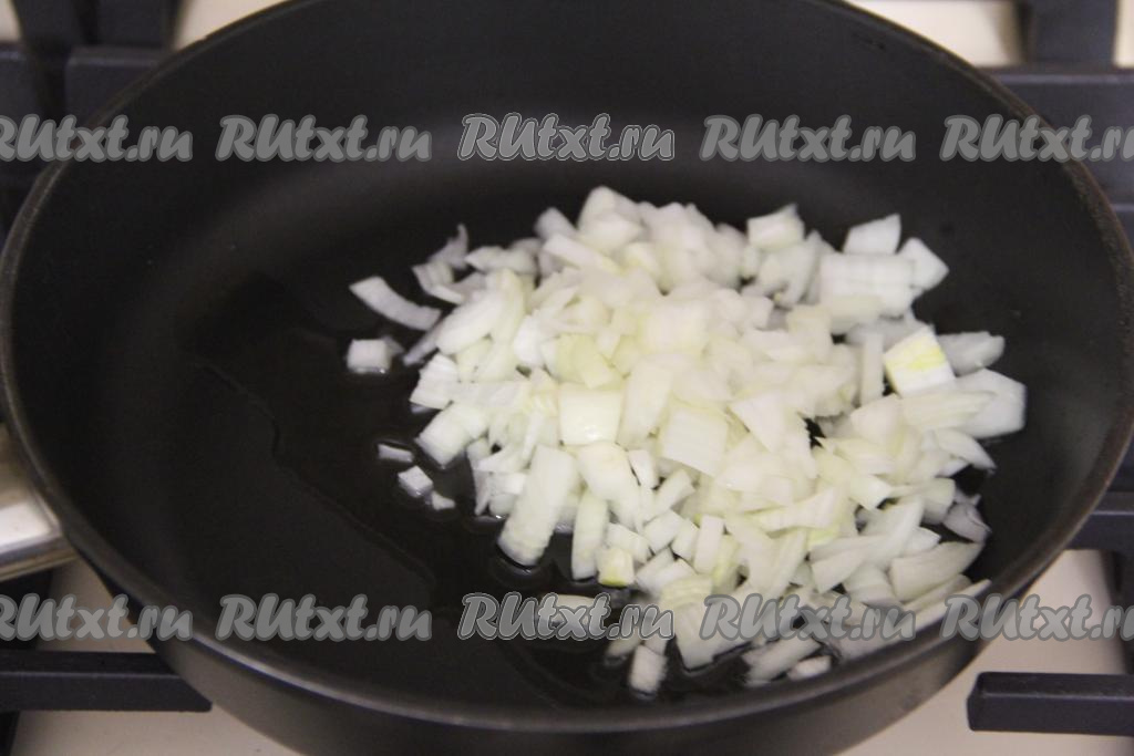 Мы будем готовить кировские смаженки с двумя видами начинки - с грибной и мясной. Пока тесто "подходит", приготовим начинки. Лук (я сразу для двух начинок взяла большую луковицу) почистить и мелко нарезать. В сковороде прогреть растительное масло, затем выложить лук и обжарить его до золотистого цвета (в течение 4-6 минут), периодически перемешивая, на среднем огне.