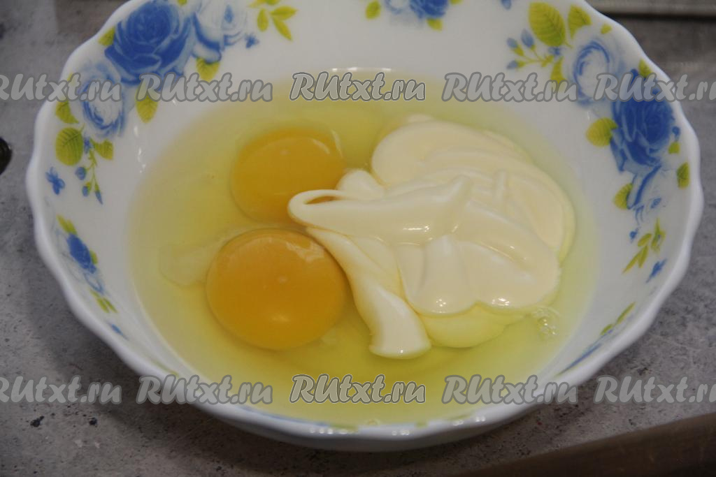Для получения заливки в глубокой тарелке соединить сырые яйца и майонез, перемешать вилкой до однородности.