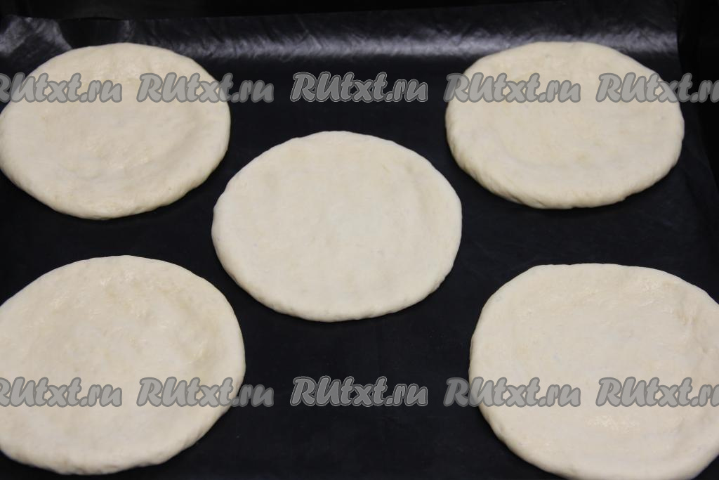 Каждую часть теста размять руками в не тонкую лепёшку и выложить на противень, застеленный ковриком (или пергаментом) для выпечки. Выкладывать лепёшки нужно на небольшом расстоянии друг от друга.