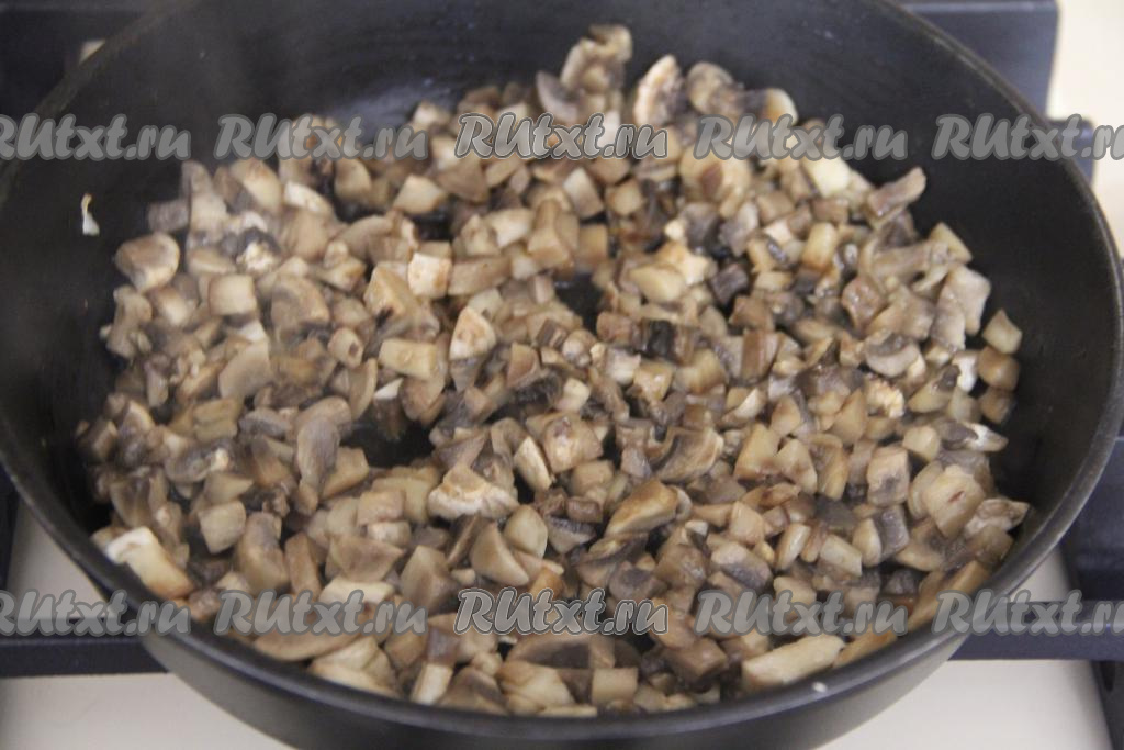 Обжаренный лук переложить на тарелку, дать ему немного остыть. Шампиньоны промыть, мелко нарезать, выложить в сковороду с маслом и обжаривать минут 15 на среднем огне, периодически помешивая.