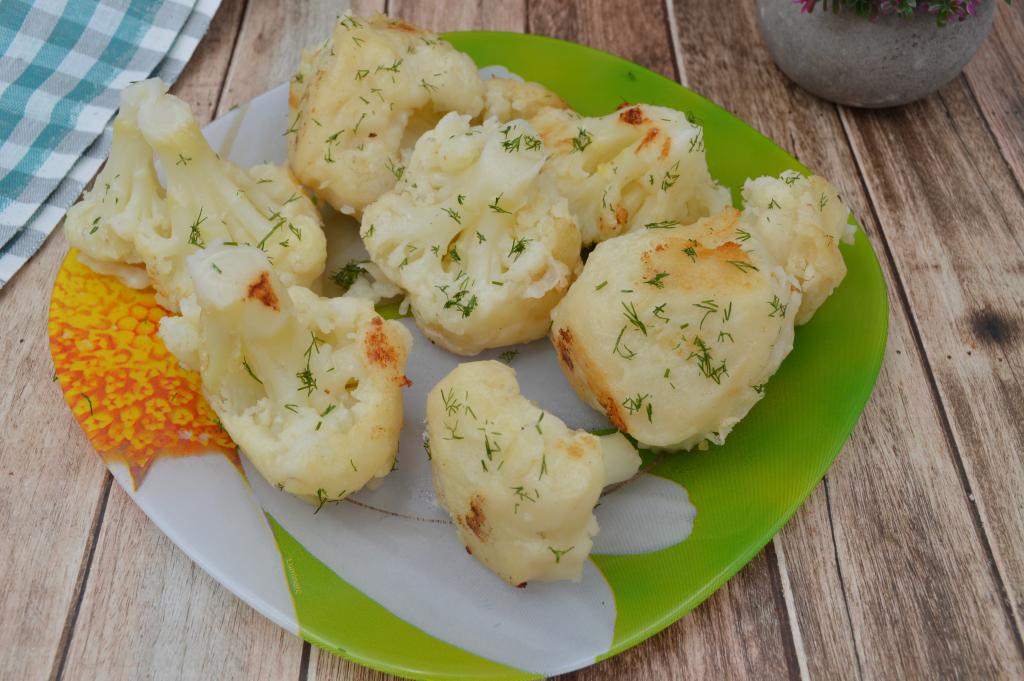 Аппетитную цветную капусту, покрытую нежнейшим постным кляром, подаём к столу, присыпав зеленью (у меня - укроп). Это блюдо лучше подавать к столу в тёплом виде, хотя и после остывания капуста остаётся вкусной.