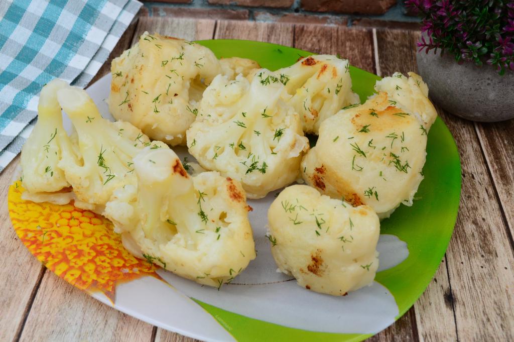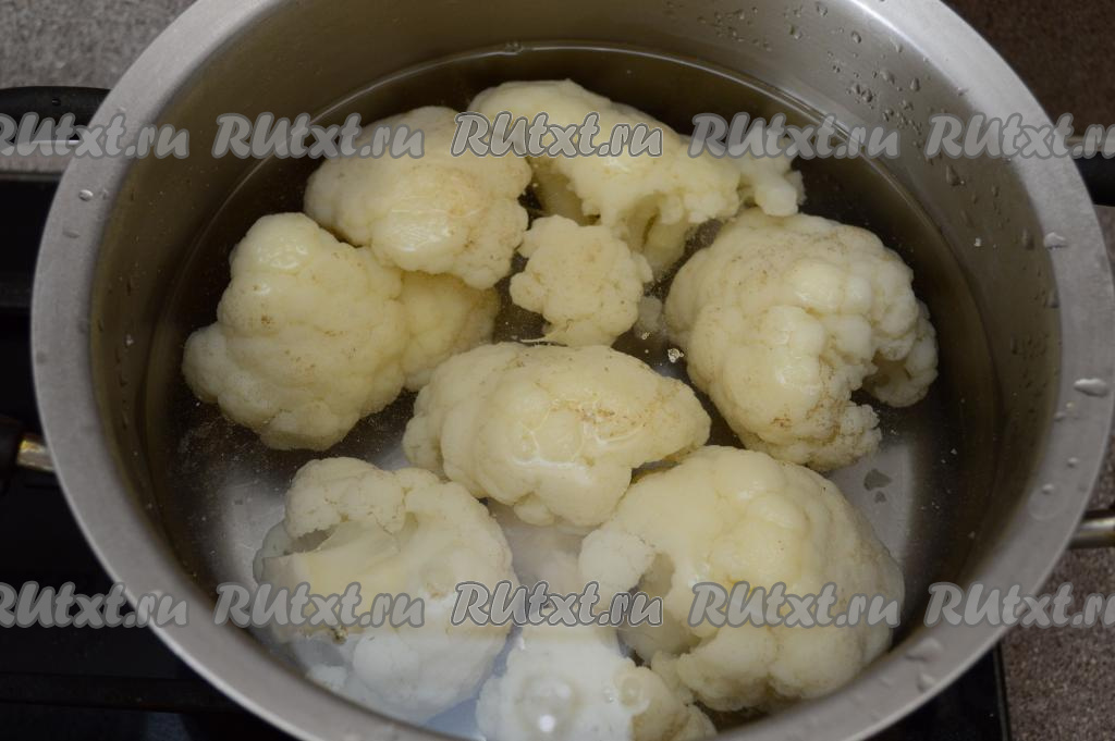 Залить капусту полностью водой и поставить на огонь. После того как вода в кастрюле с капустой закипит, подсолить её по вкусу и уменьшить огонь. Варить капусту с момента закипания на небольшом огне 5-6 минут. Соцветия должны стать мягкими и легко прокалываться ножом, но при этом они должны хорошо держать форму и не быть не разваренными. С отваренной цветной капусты слить воду и оставить её остывать.