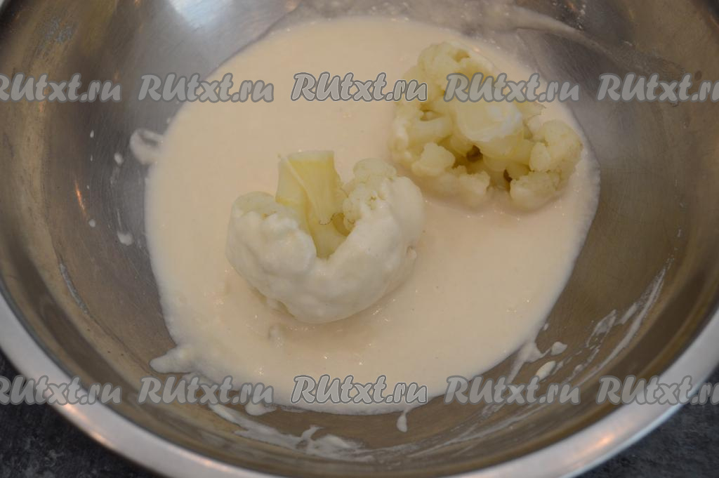 Перемешать кляр до однородности, чтобы не было комочков. Кляр получится по консистенции, как сметана средней густоты. Он в дальнейшем должен будет полностью обволакивать цветную капусту, хорошо держаться на поверхности.