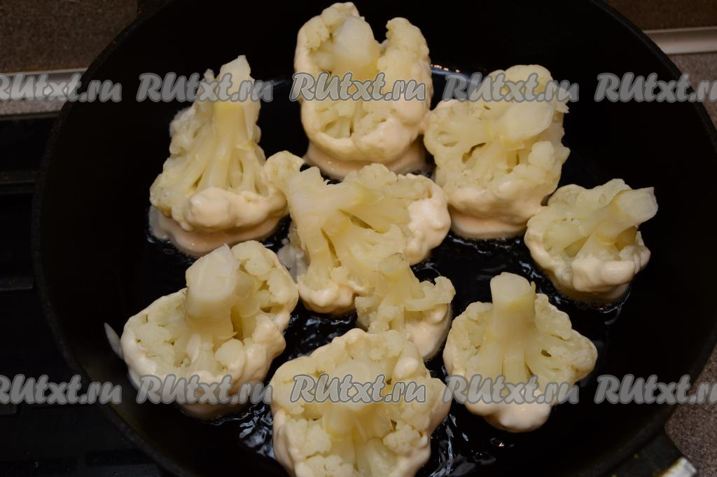 Жарить цветную капусту в постном кляре на среднем огне минут 7-8 (до подрумянивания кляра). Соцветия периодически переворачиваем, чтобы они равномерно обжарились.