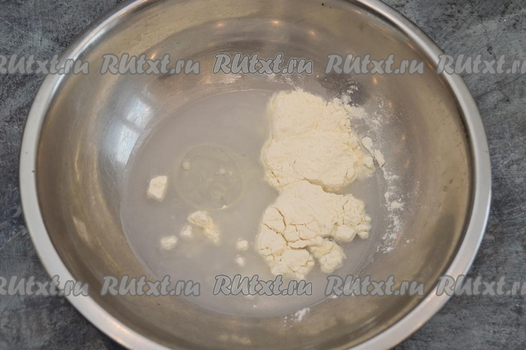 После того как цветная капуста остынет, займёмся замешиванием постного кляра. Для этого в миску нужно влить воду и растительное масло, всыпать муку, добавить соль по вкусу.
