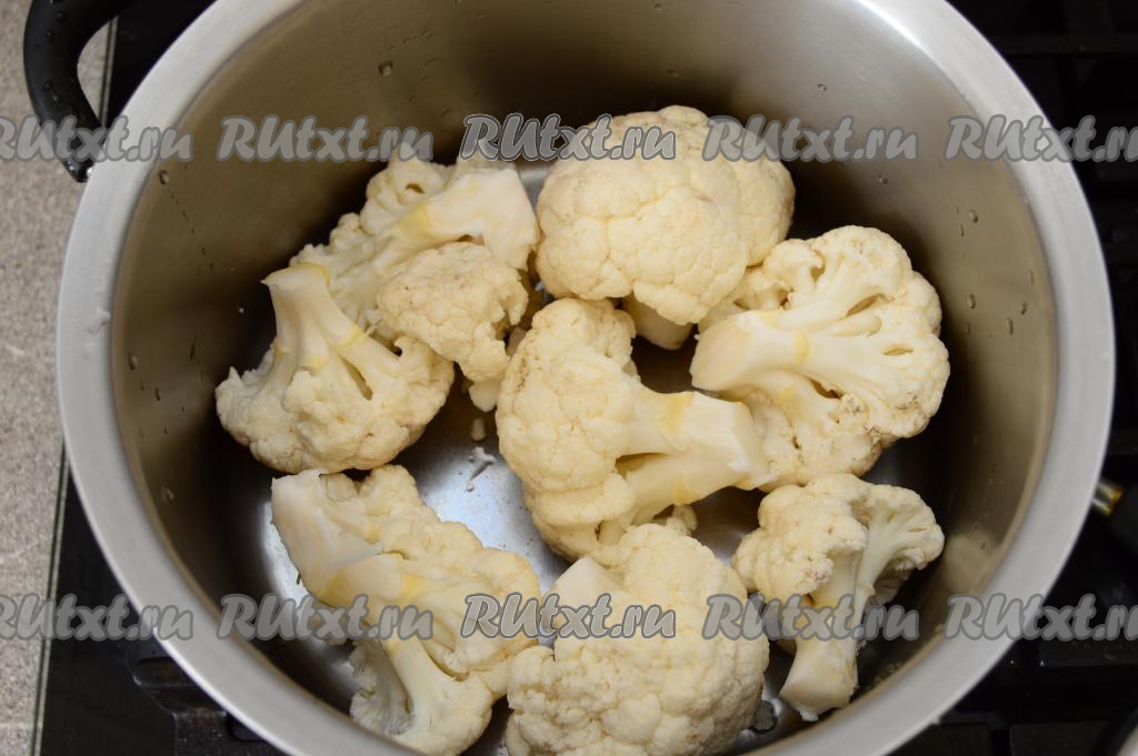 Цветную капусту промыть водой, разрезать на соцветия и выложить в кастрюлю.