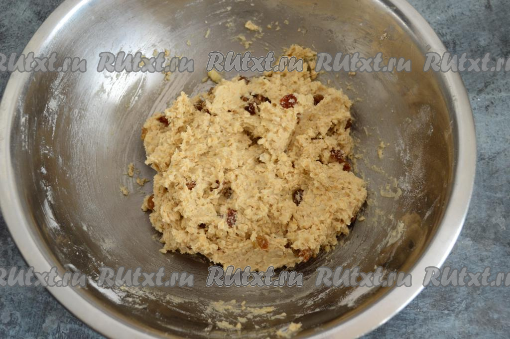 Добавить измельчённые овсяные хлопья в тесто и перемешать. Тесто должно стать комковатым, достаточно густым, оно будет липнуть к рукам. Всыпать изюм в тесто.