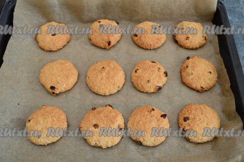 Домашнее овсяное печенье с изюмом выпекать в разогретой до 180 градусов духовке в течение 15-20 минут. Слишком сильно оно не подрумянится и будет достаточно светлым. Я в течение 1 минуты подрумянила его на режиме "Гриль" .