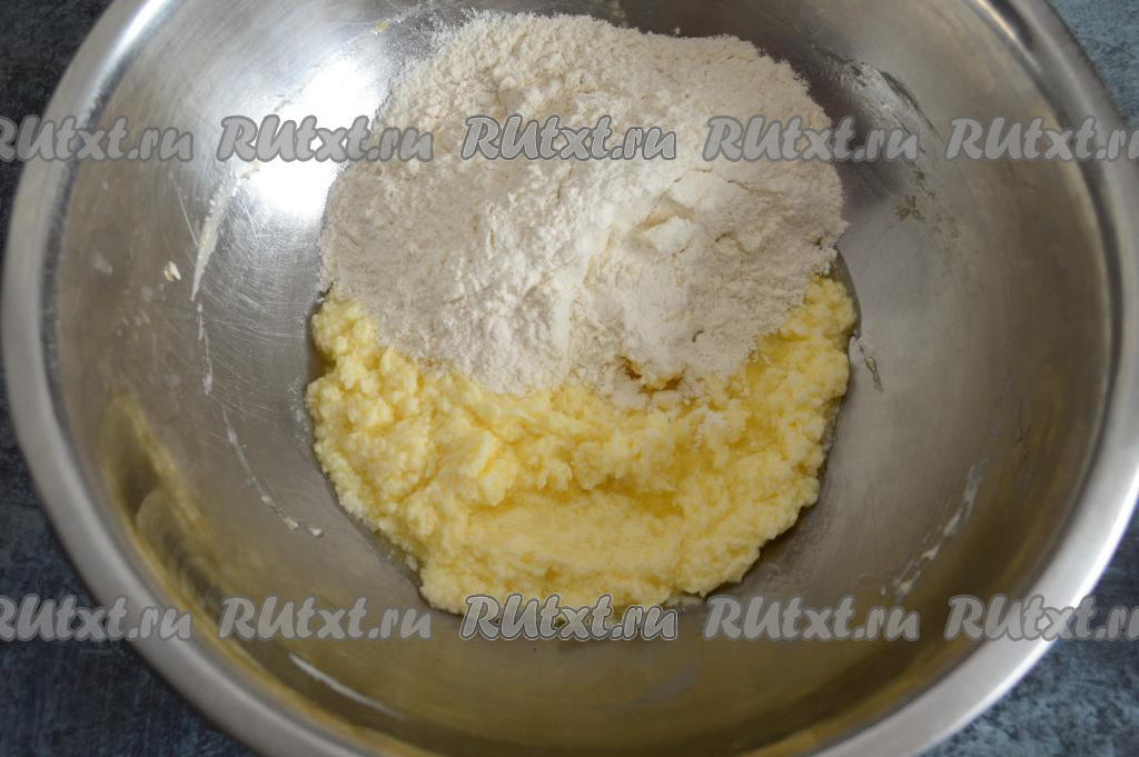 Всыпать в миску разрыхлитель и муку, перемешать тесто до однородности.