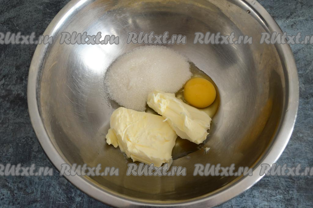 В глубокую миску выложить сахар, сливочное масло комнатной температуры, вбить яйцо.