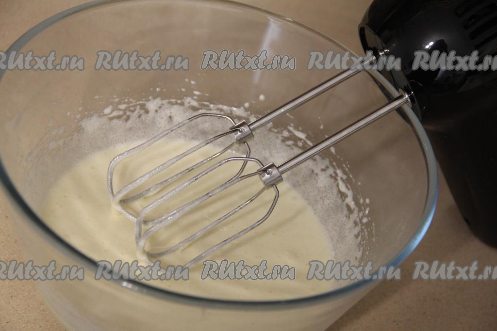 В объёмной миске миксером взбить яйца с сахаром и ванильным сахаром до увеличения в объёме и побеления массы (взбивать нужно минут 4-5).