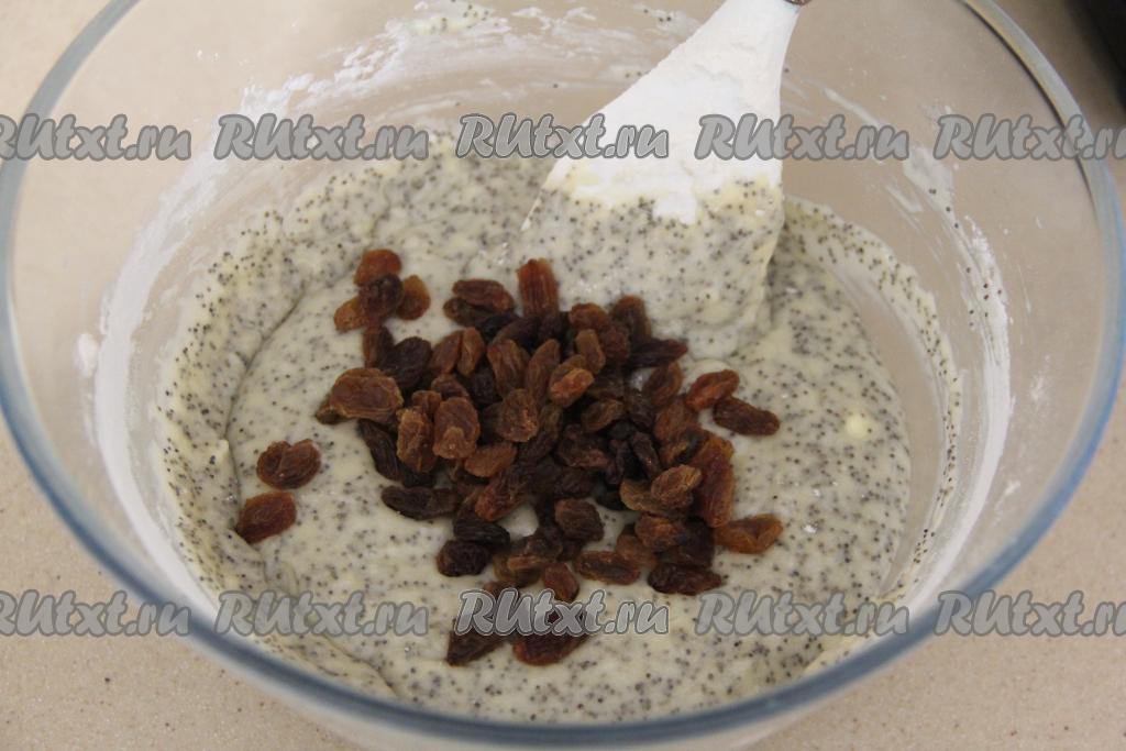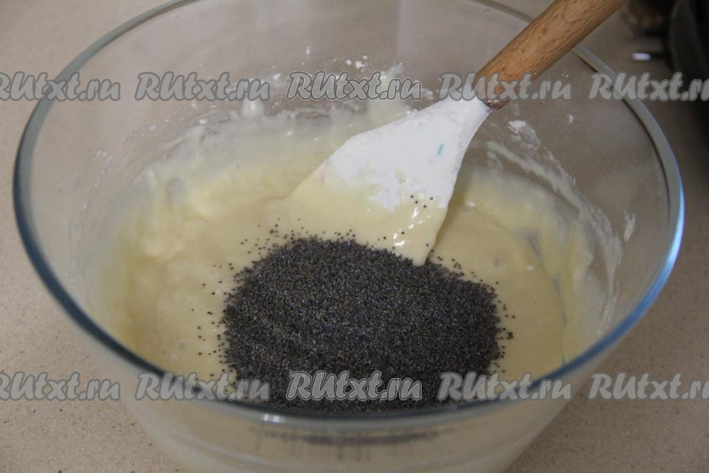 Добавляя муку, учитывайте, что тесто должно получиться не очень густым (по консистенции оно будет напоминать средней густоты сметану), воздушным. Добавить сухой мак и перемешать тесто.