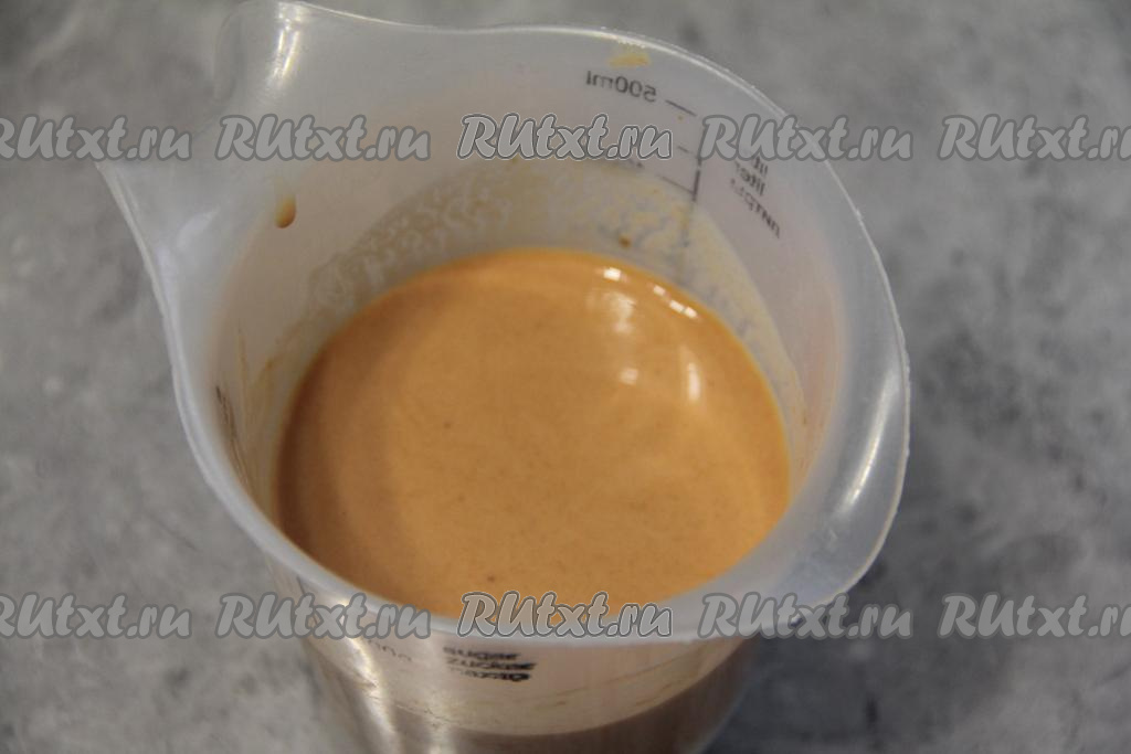 Для приготовления соуса, в котором будет тушиться навага, нужно соединить в отдельной ёмкости сметану, томатную пасту и воду, посолить по вкусу и перемешать.