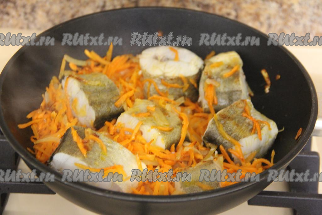 Обжаривать навагу с овощами минут 7 на среднем огне, время от времени аккуратно перемешивая. За это время рыба должна подрумяниться с двух сторон, а морковка - стать достаточно мягкой.