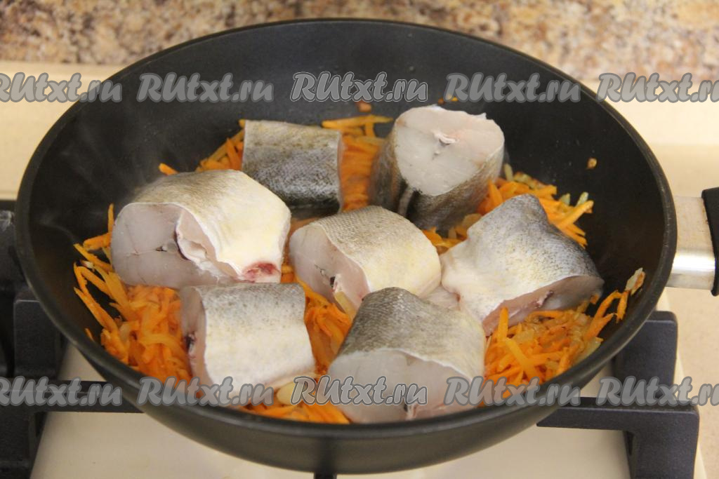 Нарезать навагу на кусочки шириной 3-4 сантиметра. Посолить кусочки рыбы и выложить в сковороду.