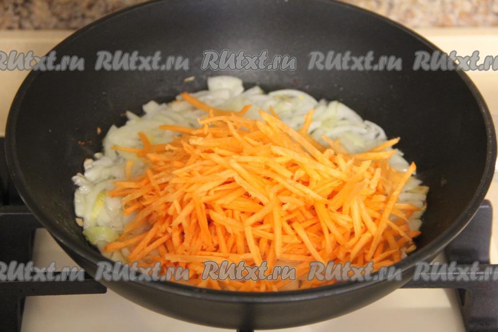 К обжаренному луку добавить натёртую на крупной тёрке морковку, перемешать овощи и обжаривать их минуты 3-4, иногда перемешивая.