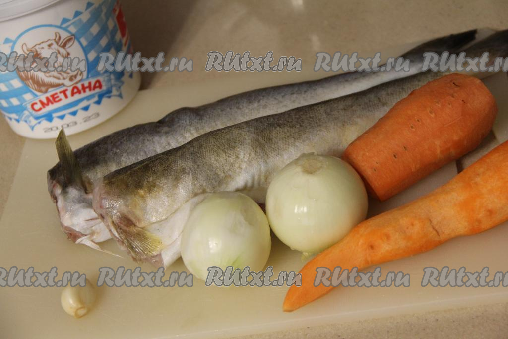 Навагу разморозить, удалить голову, плавники, хвост и внутренности, не забывая убрать чёрную плёнку из брюшка. Промыть рыбу водой и обсушить. Лук, чеснок и морковь почистить.