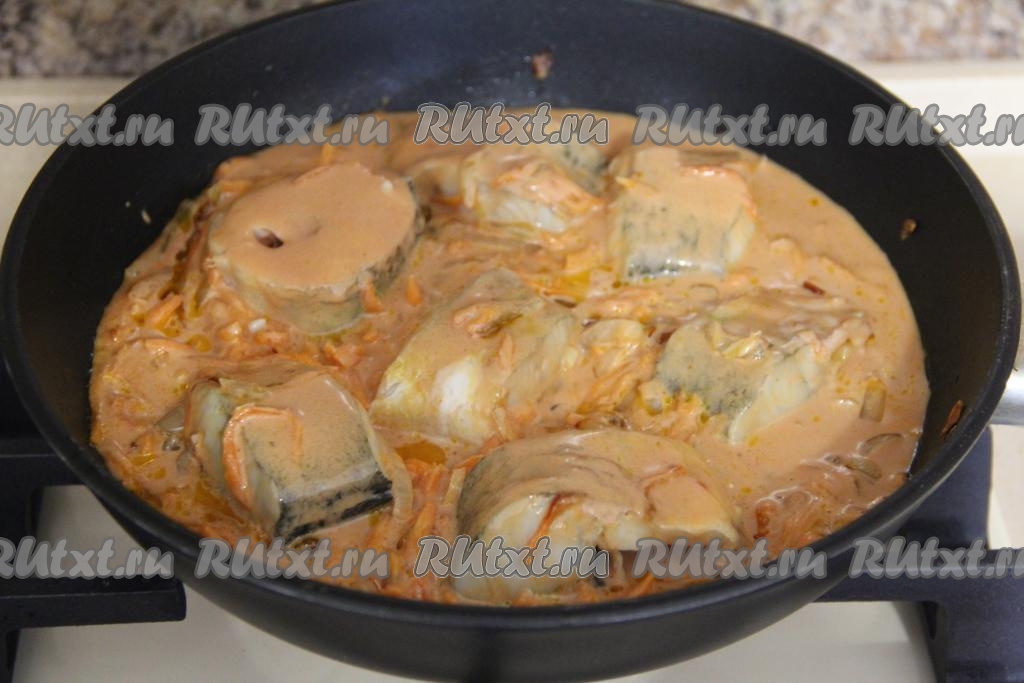 Тушить навагу с овощами в соусе 15 минут. В конце приготовления добавить пропущенный через пресс чеснок. Сковороду убрать с огня и оставить рыбку настояться минут на 10.