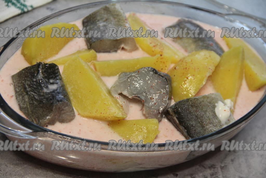 Залить навагу с картошкой получившимся сметанным соусом и поставить в разогретую духовку.
