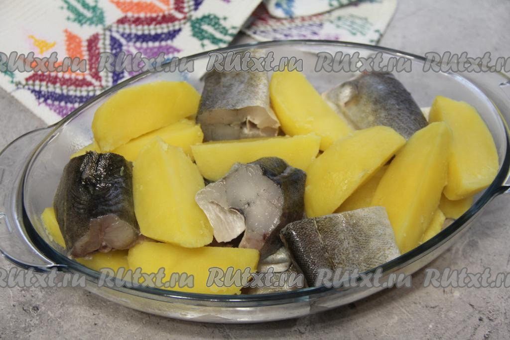 Навагу нарезать на кусочки шириной примерно 3-4 сантиметра, посолить. Нарезать слегка остывший картофель на крупные дольки. В жаропрочную форму выложить дольки картофеля и кусочки наваги.