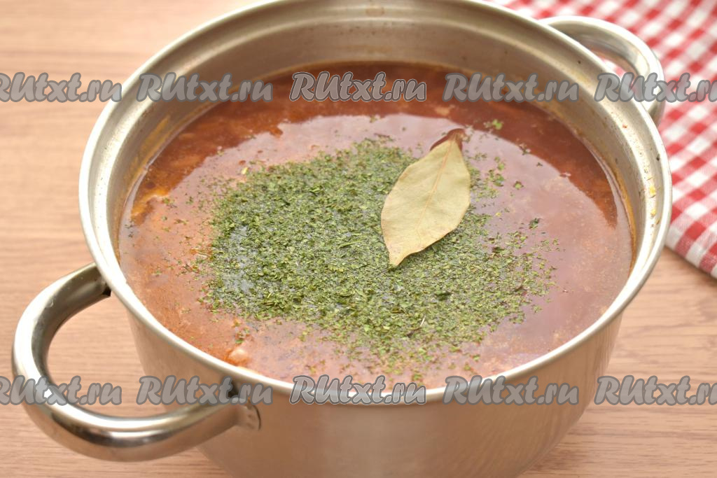 В конце приготовления борщ по вкусу перчим, если нужно, досаливаем, добавляем лавровый лист и мелко нарезанную свежую зелень (можно добавить и сушёную или замороженную зелень), перемешиваем, даём закипеть, провариваем минуты 2 на небольшом огне. Убираем кастрюлю с огня, накрываем крышкой и даём борщу с куриными ножками настояться 10 минут.