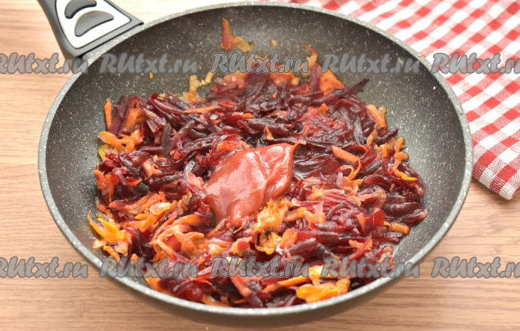 К обжаренным овощам добавляем варёную свеклу, натёртую на крупной тёрке, перемешиваем.