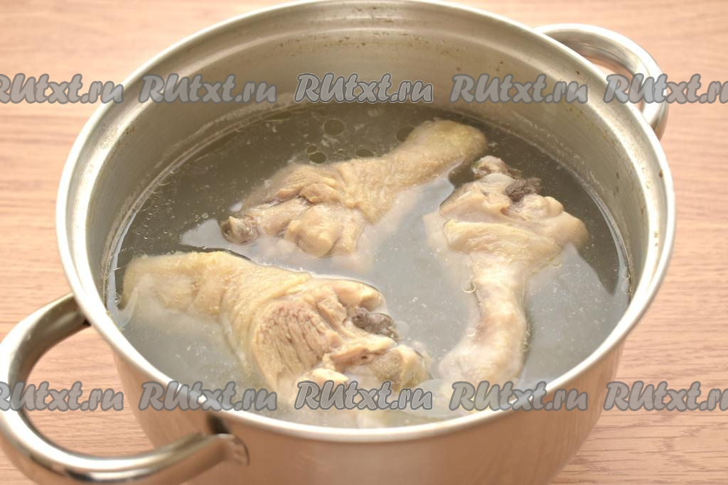 Куриные ножки промываем водой, перекладываем в кастрюлю, вливаем 2 литра воды, ставим на огонь. После закипания снимаем образовавшуюся на поверхности пену, варим мясо 35-40 минут. Заранее (или пока варятся ножки) в отдельной кастрюле отвариваем в кожуре свеклу до готовности (готовая свекла должна легко прокалываться ножом, мне на варку потребовалось 45 минут). Варёную свеклу остужаем, очищаем. После того как ножки проварятся с момента закипания 35-40 минут, достаём их из кастрюли и даём остыть. Куриный бульон, если нужно, процеживаем, затем по вкусу солим и снова ставим на огонь.