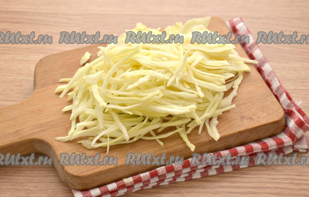 Сразу же добавляем в кастрюлю капусту, нарезанную на тонкие полоски, даём куриному бульону закипеть. Уменьшив огонь, варим картошку с капустой 20 минут.