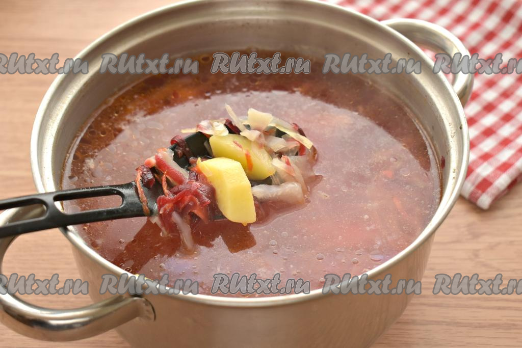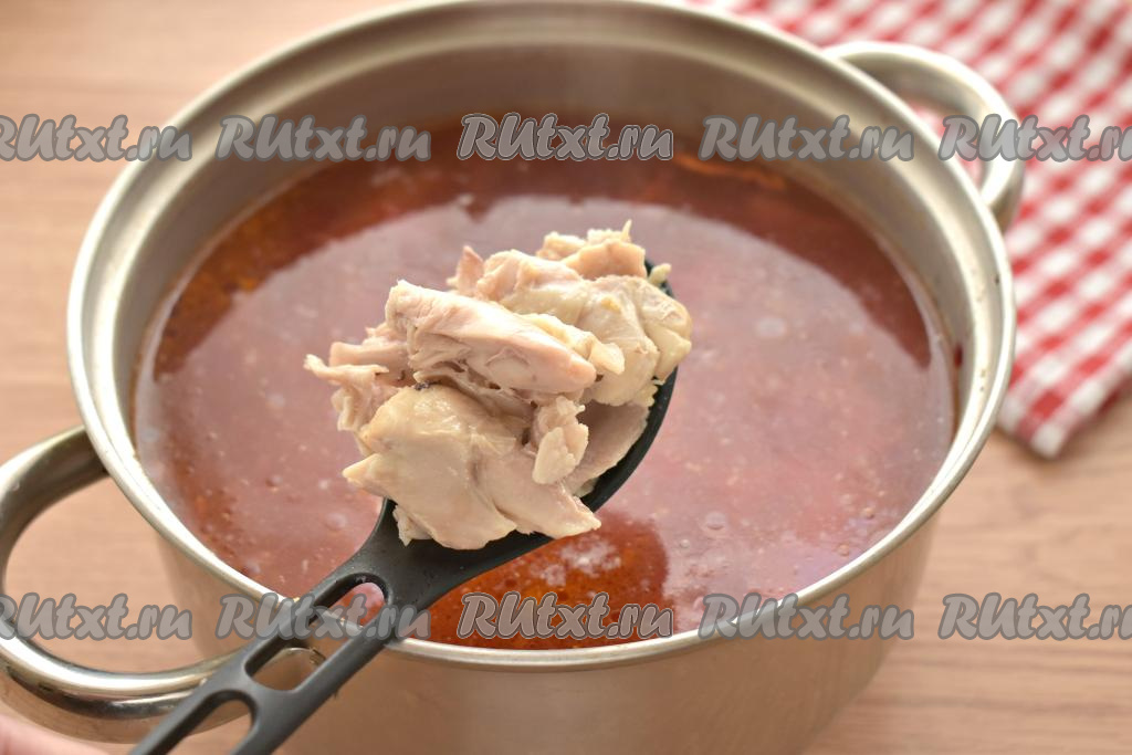 Отделяем остывшие куриные ножки от костей и кожи, затем мясо нарезаем на кусочки. Сразу после добавления тушёных овощей выкладываем в кастрюлю нарезанное мясо. Даём борщу закипеть, а после этого варим на небольшом огне 5-7 минут.