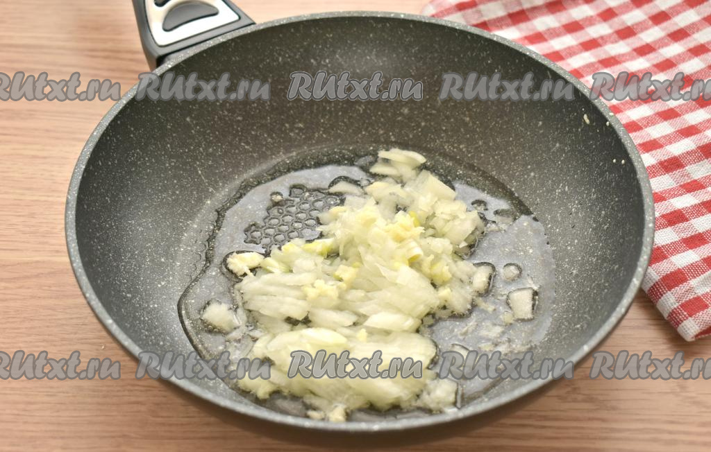Очищаем лук, чеснок и морковь. В сковороду вливаем растительное масло, немного прогреваем его на достаточно сильном огне, уменьшаем огонь до среднего, выкладываем мелко нарезанный лук и пропущенный через пресс чеснок, перемешиваем, обжариваем минуты 2, иногда помешивая.
