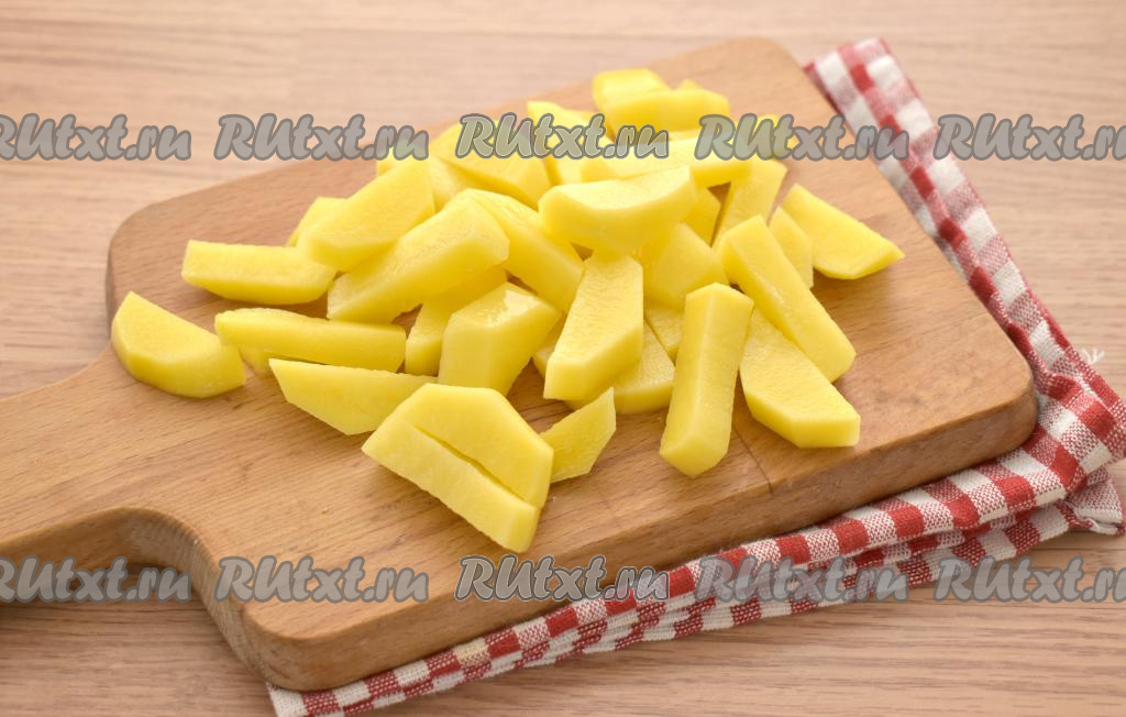 Картофель нарезаем на брусочки среднего размера, перекладываем в кастрюлю с закипевшим бульоном.