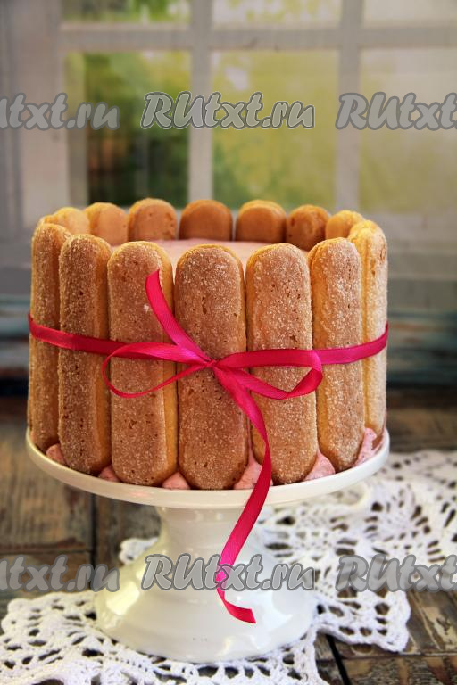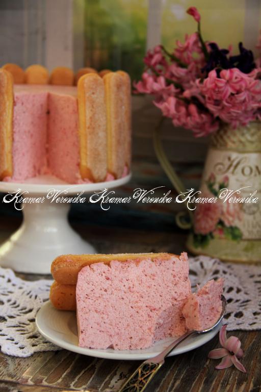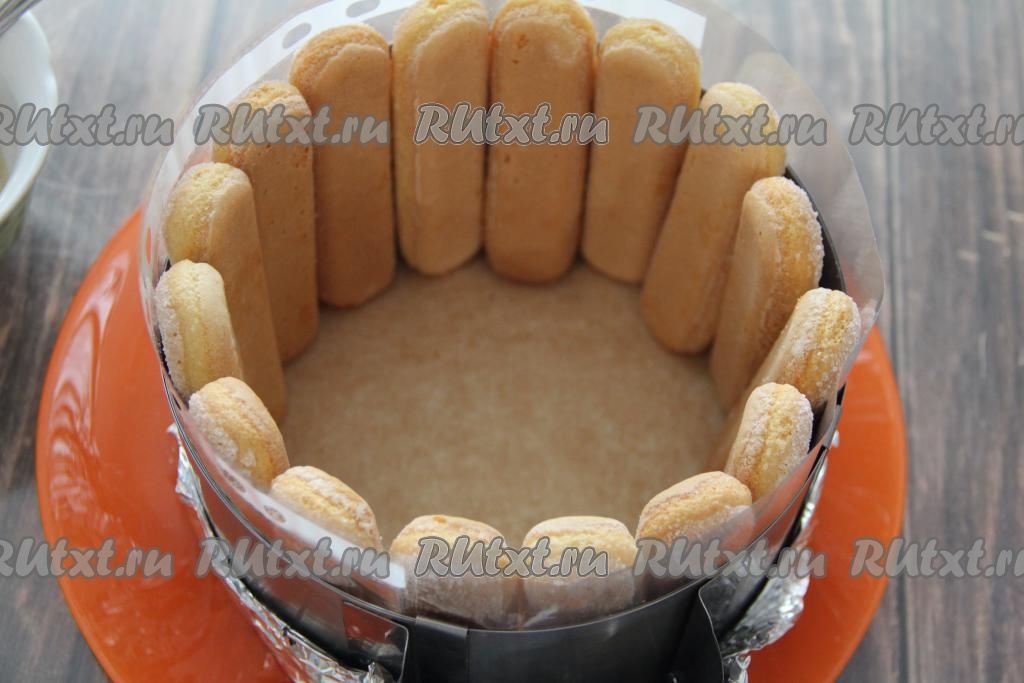 Бока формы для выпечки (я взяла форму диаметром 16 сантиметров) заранее выстелить ацетатной плёнкой (или файликами). Поставить по краю бортика печенье "Савоярди". Если такого печенья нет, можно обойтись и без него (то есть торт будет полностью состоять из мусса, приготовленного из клубники, сливок и желатина).