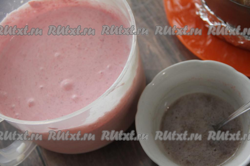 Соединить взбитые сливки и клубнику, взбить мусс миксером. Желатин прогреть на среднем огне, помешивая, до полного растворения кристалликов желатина, но не кипятить. Влить желатин в мусс из клубники и сливок, перемешать миксером до однородности.