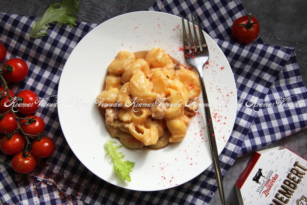 Варить сливочно-сырный соус на небольшом огне, помешивая, до полного растворения сыра, убрать с огня.