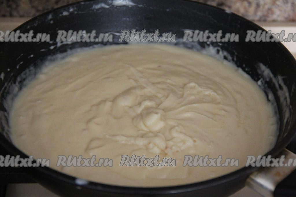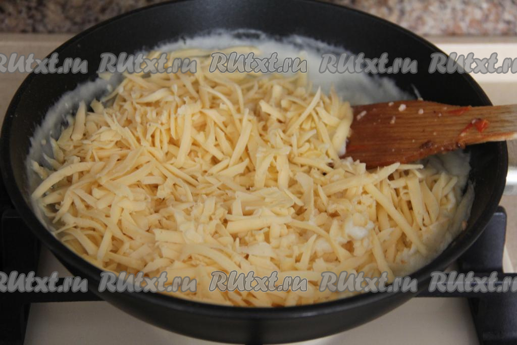 В получившийся соус выложить сыр, натёртый на крупной тёрке.
