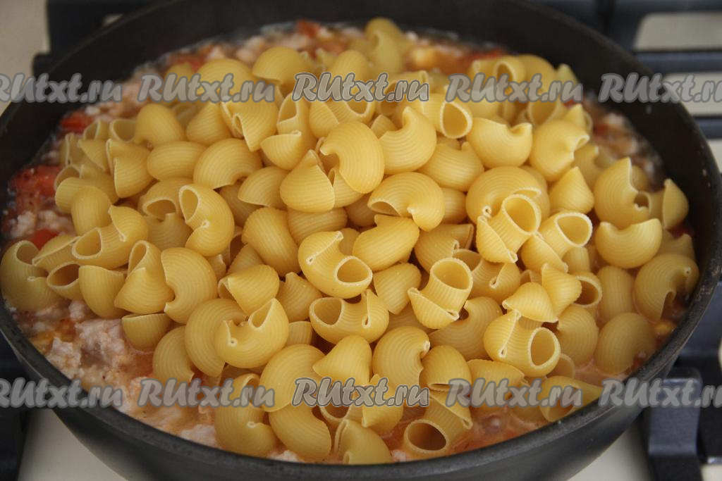 Всыпать сухие макароны в сковороду, влить 500 миллилитров горячей воды, перемешать, довести до кипения, уменьшить огонь до минимума.