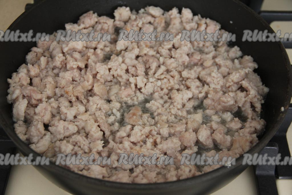 Для этого блюда можно взять любой фарш (я взяла фарш из свинины). В сковороду влить растительное масло, разогреть, выложить фарш. Жарить фарш, постоянно разбивая комочки мяса, на среднем огне минут 10.