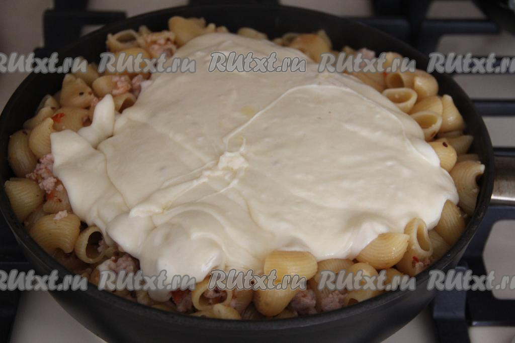 Горячий сливочно-сырный соус выложить в сковороду к макаронам, приготовленным с фаршем, перемешать.