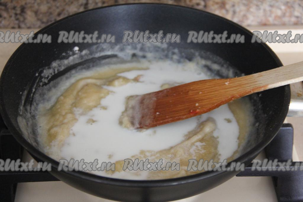 Затем влить молоко и тщательно перемешать соус до однородного состояния.