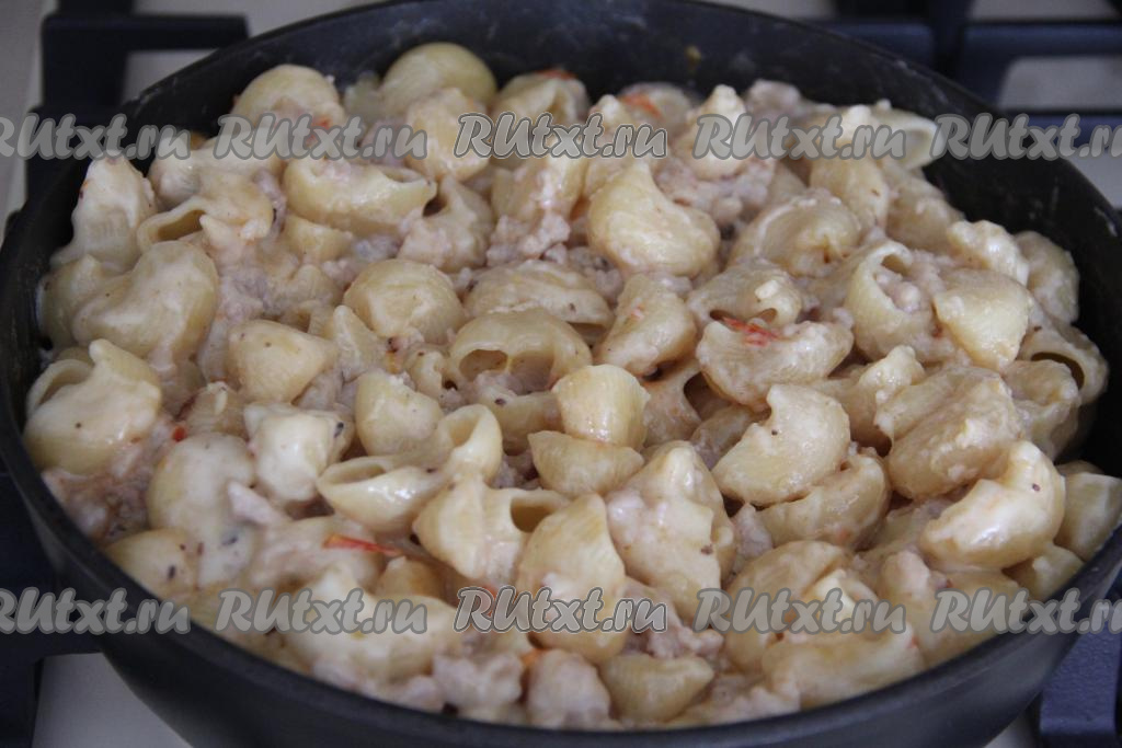 Накрыть сковороду крышкой и готовить минут 10-13, за это время блюдо нужно будет 2-3 раза аккуратно перемешать. По истечении времени макароны должны быть полностью готовы (они должны стать мягкими, но не переваренными).