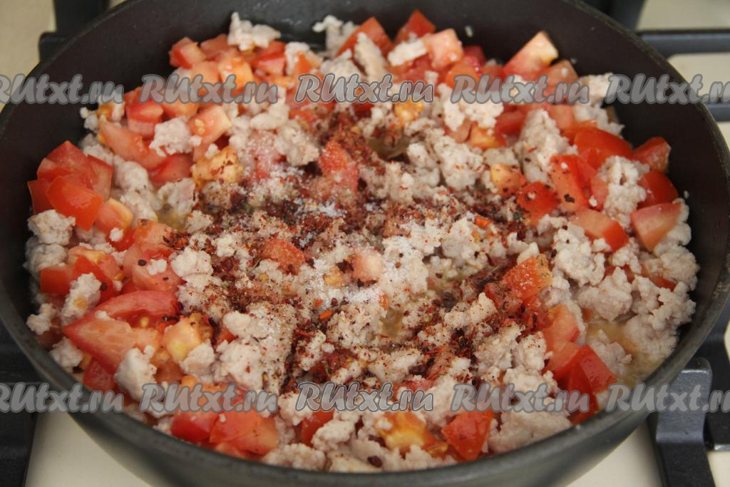 Помидоры вымыть, по желанию, очистить от кожуры, мелко нарезать, добавить в сковороду с обжаренным фаршем, перемешать и обжаривать минуты 3, периодически перемешивая. Затем посолить, добавить любые специи, перемешать.