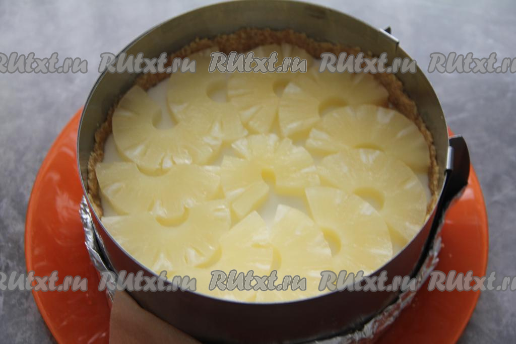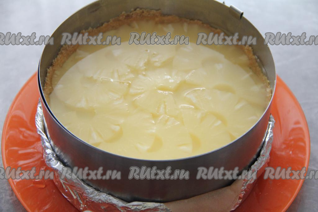Аккуратно влить желатиновую заливку на кусочки консервированных ананасов. Поставить чизкейк на ночь в холодильник.