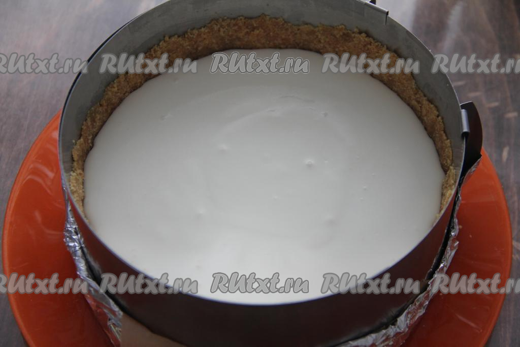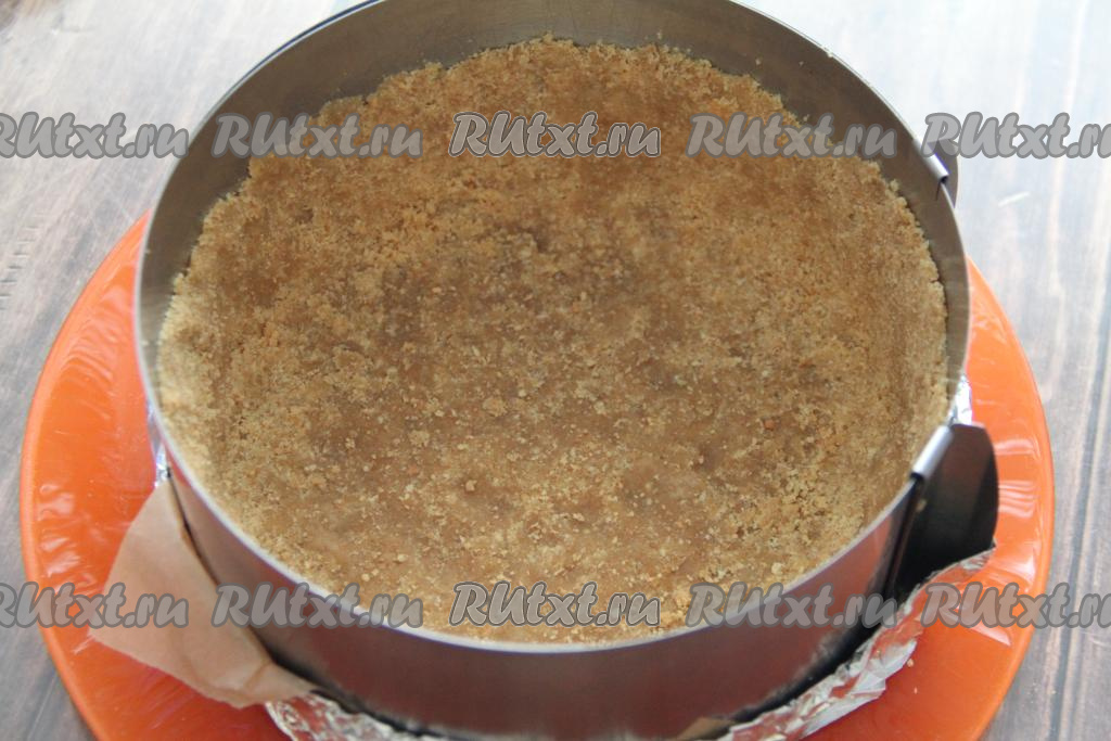 Перемешать получившуюся массу ложкой и выложить в форму. Утрамбовать дно и сформировать высокие бортики. Поставить форму в холодильник до того момента, когда в неё нужно будет выкладывать творожную массу.