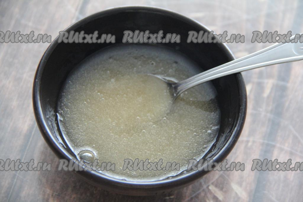 Для приготовления творожной начинки нужно в небольшую ёмкость выложить 20 грамм желатина, залить 50 миллилитрами холодной воды, хорошо перемешать и оставить желатин набухать минут на 15.