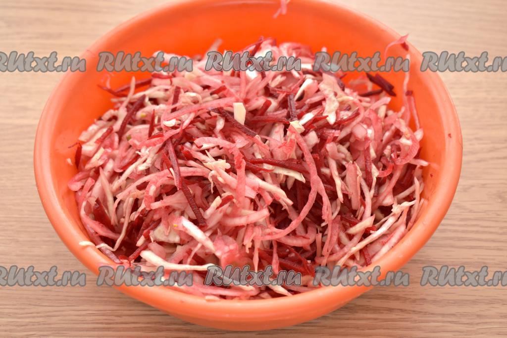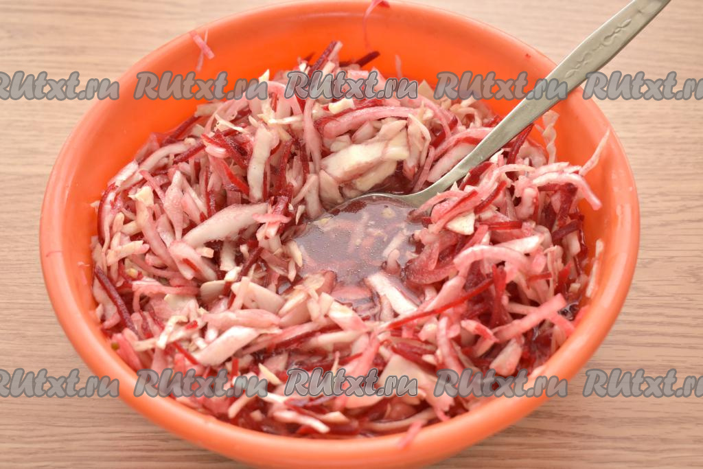 Выливаем горячий маринад в миску с капустой, свеклой, чесноком и луком, сразу перемешиваем ложкой. Жидкости будет достаточно, так как из овощей начнёт выделяться сок.