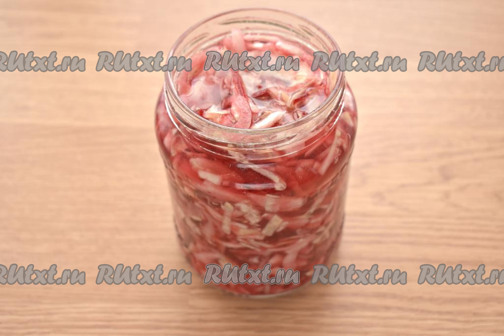 Для удобства маринования овощи вместе с маринадом перекладываем в банку (я взяла банку объёмом 1 литр), прикрываем крышкой и ставим в холодильник на 5-6 часов.