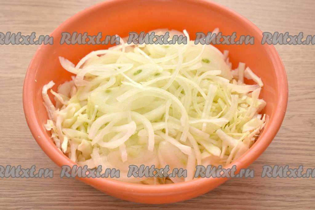 Очищенный лук нарезаем полукольцами и добавляем в миску с капустой.