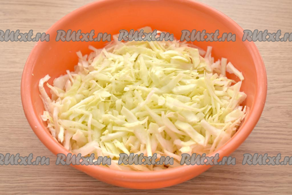 Капусту нарезаем тонкой соломкой и перекладываем в миску, тщательно мнём руками, чтобы капуста стала более мягкой и сочной.