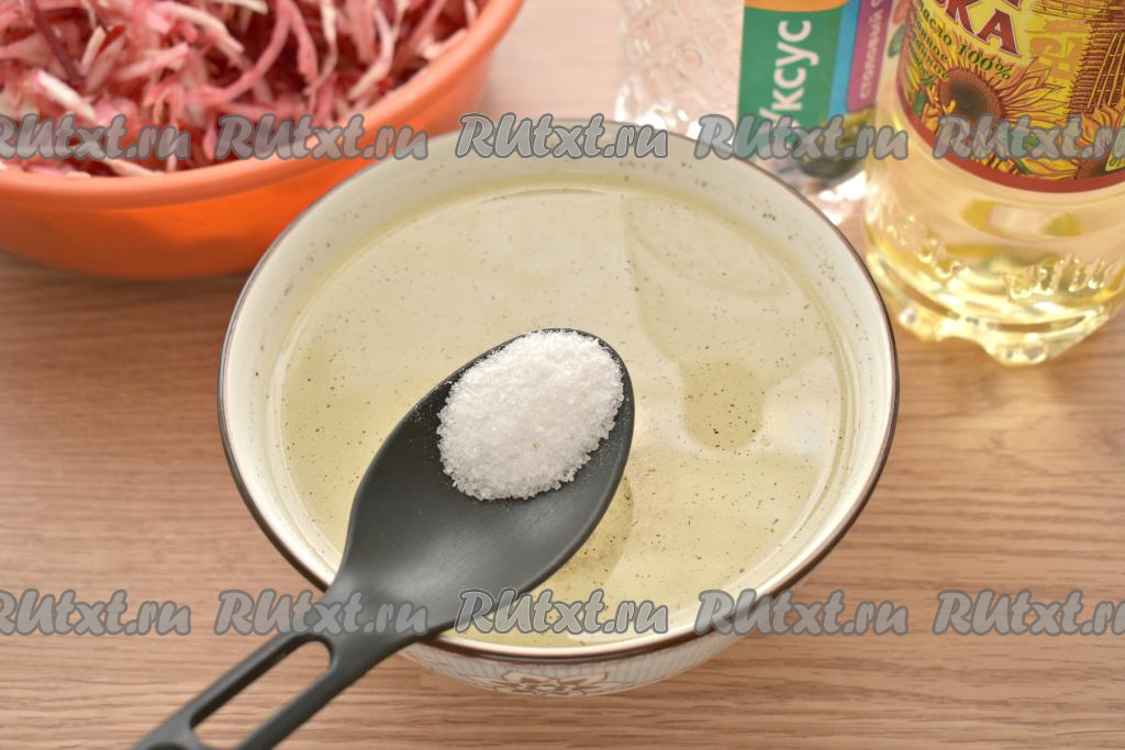 В отдельную миску насыпаем сахар, чёрный молотый перец, соль, вливаем уксус, растительное масло и 250 миллилитров кипятка, хорошо перемешиваем и маринад готов. Кстати, с помощью такого маринада можно мариновать любые овощи, учитывая, что если овощей взять, например, в 2 раза больше, то и ингредиентов для приготовления маринада потребуется в 2 раза больше.