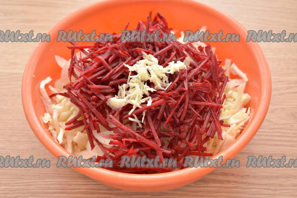 Натираем очищенную сырую свеклу на тёрке (я использовала тёрку для моркови по-корейски). Очищенные зубчики чеснока натираем на средней тёрке (или мелко нарезаем). Свеклу с чесноком перекладываем в миску с капустой и луком.